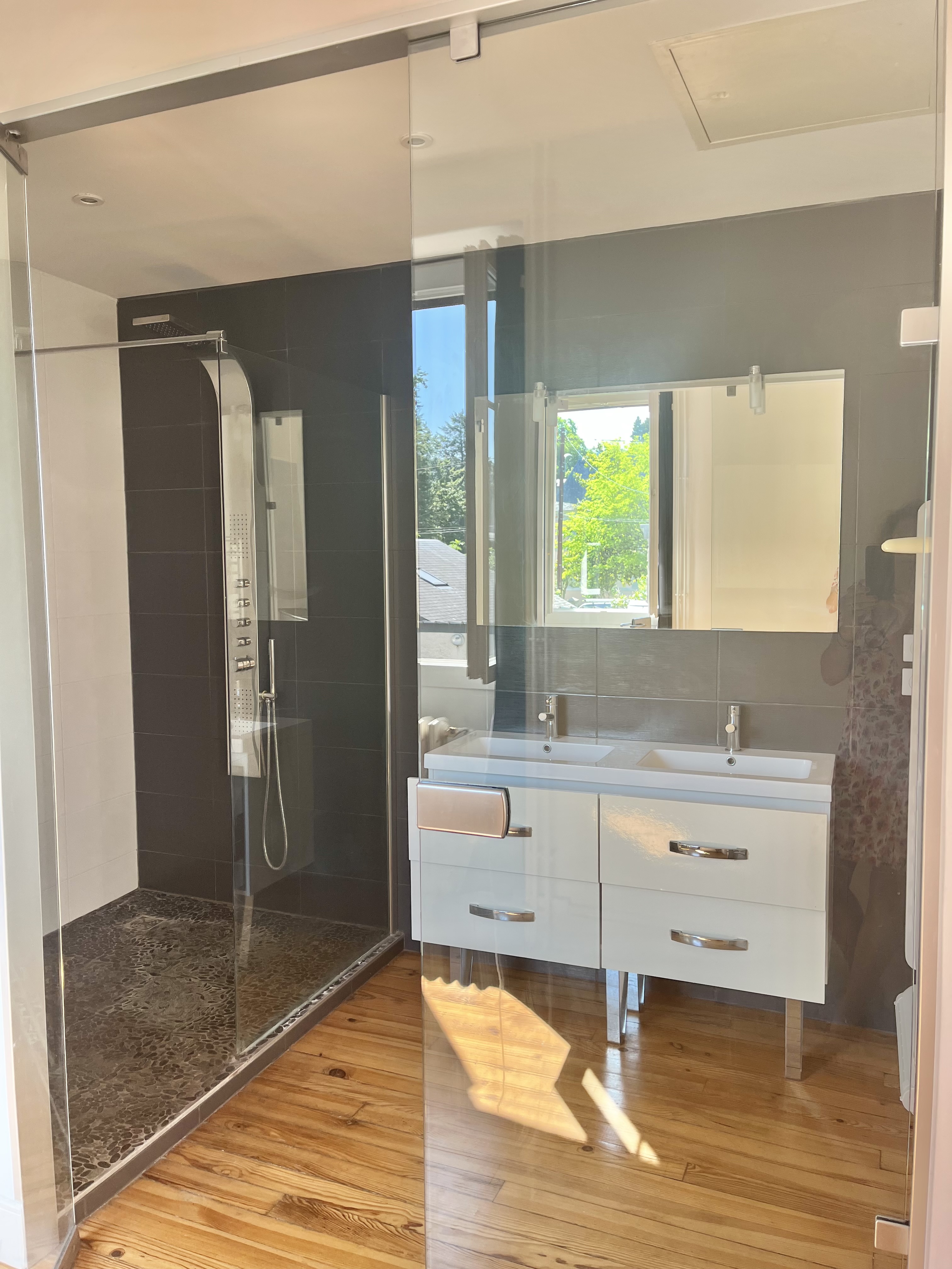 – Au 1er étage : un bel appartement vide, lumineux, traversant, de type T2, d’environ 67m², comprend : entrée, cuisine équipée ouverte sur la pièce principale avec sa cheminée et parquet donnant sur un balcon Ouest, un cellier, une grande chambre, salle de douche à l’italienne et WC indépendant.