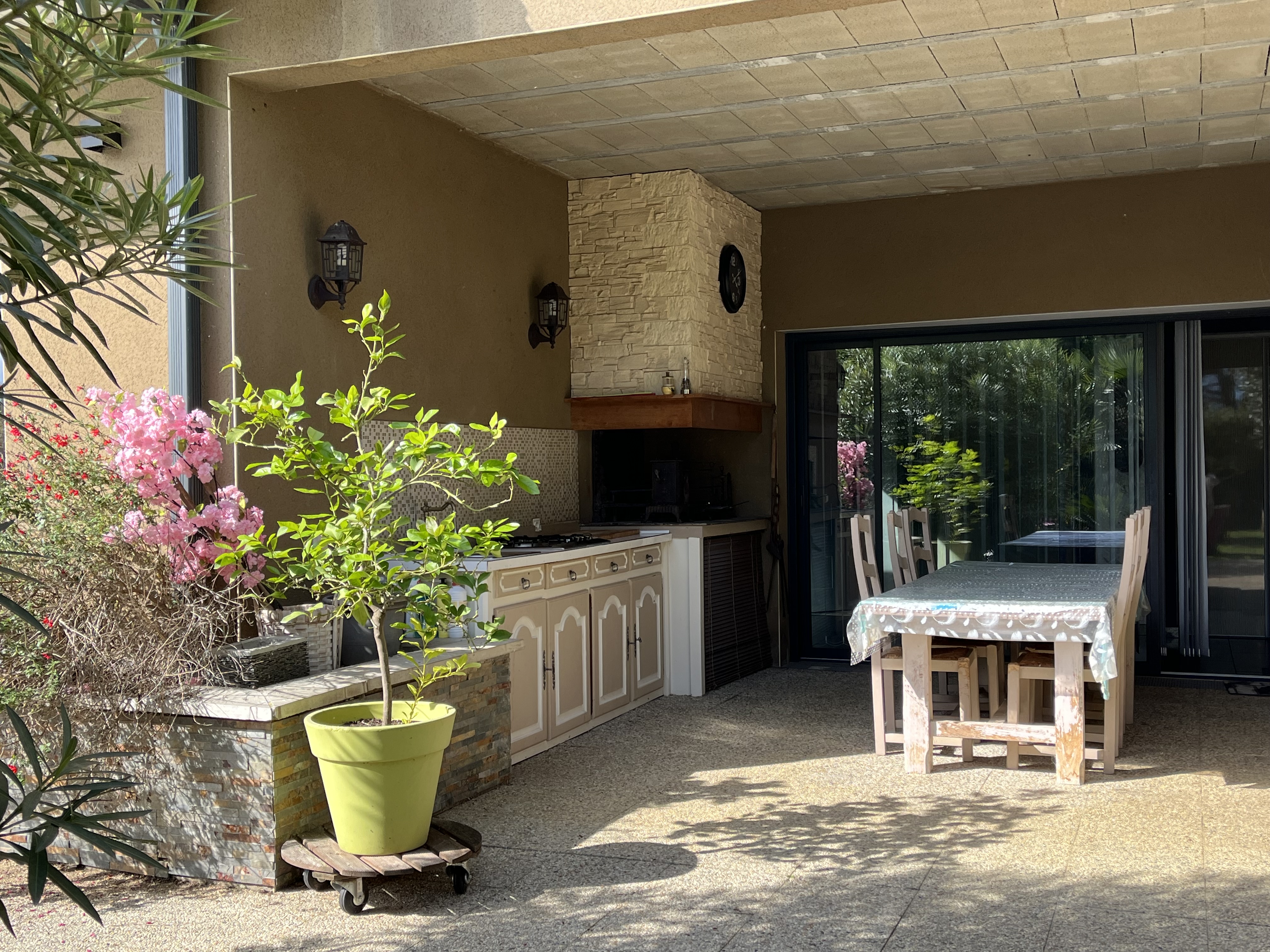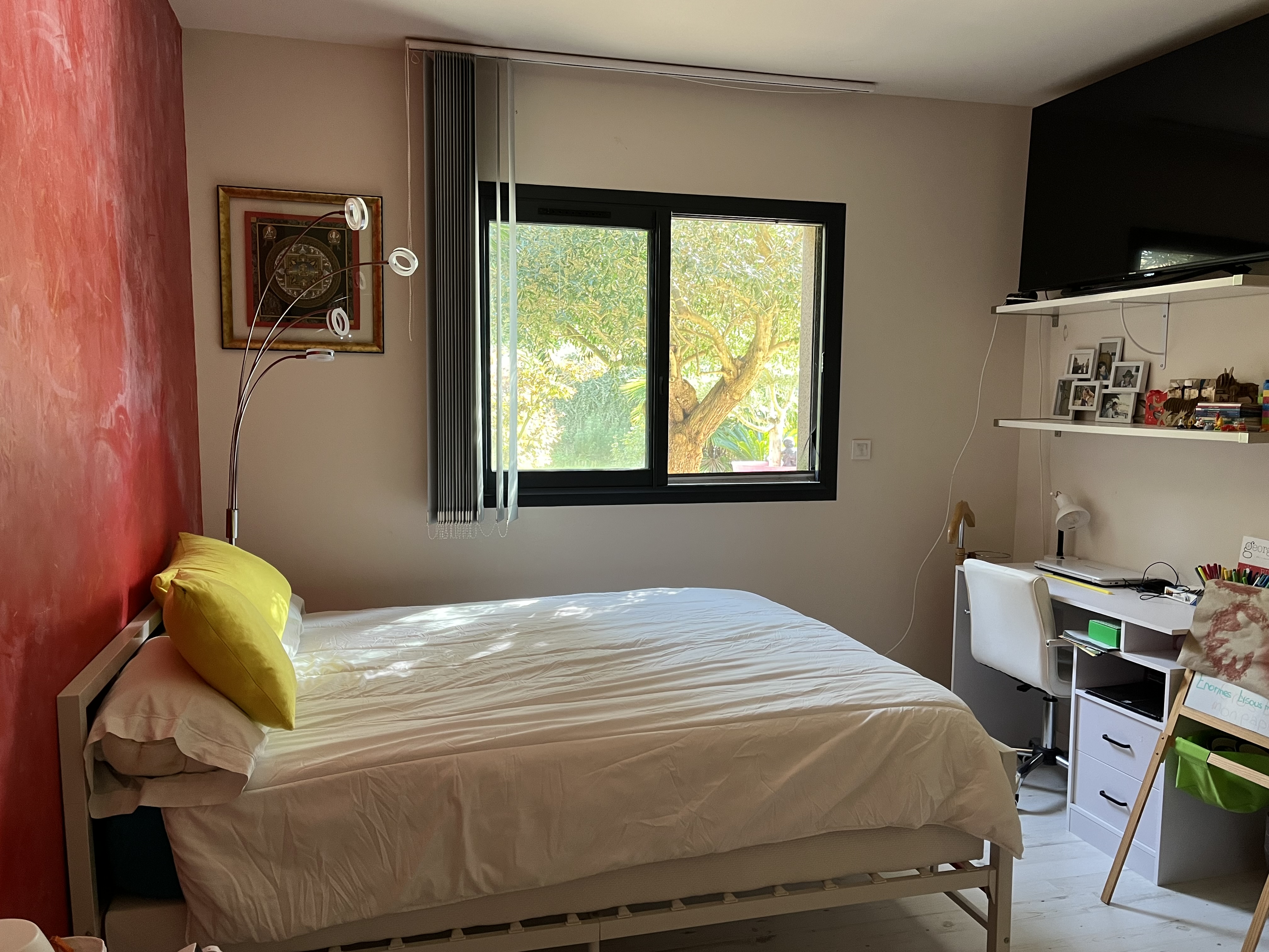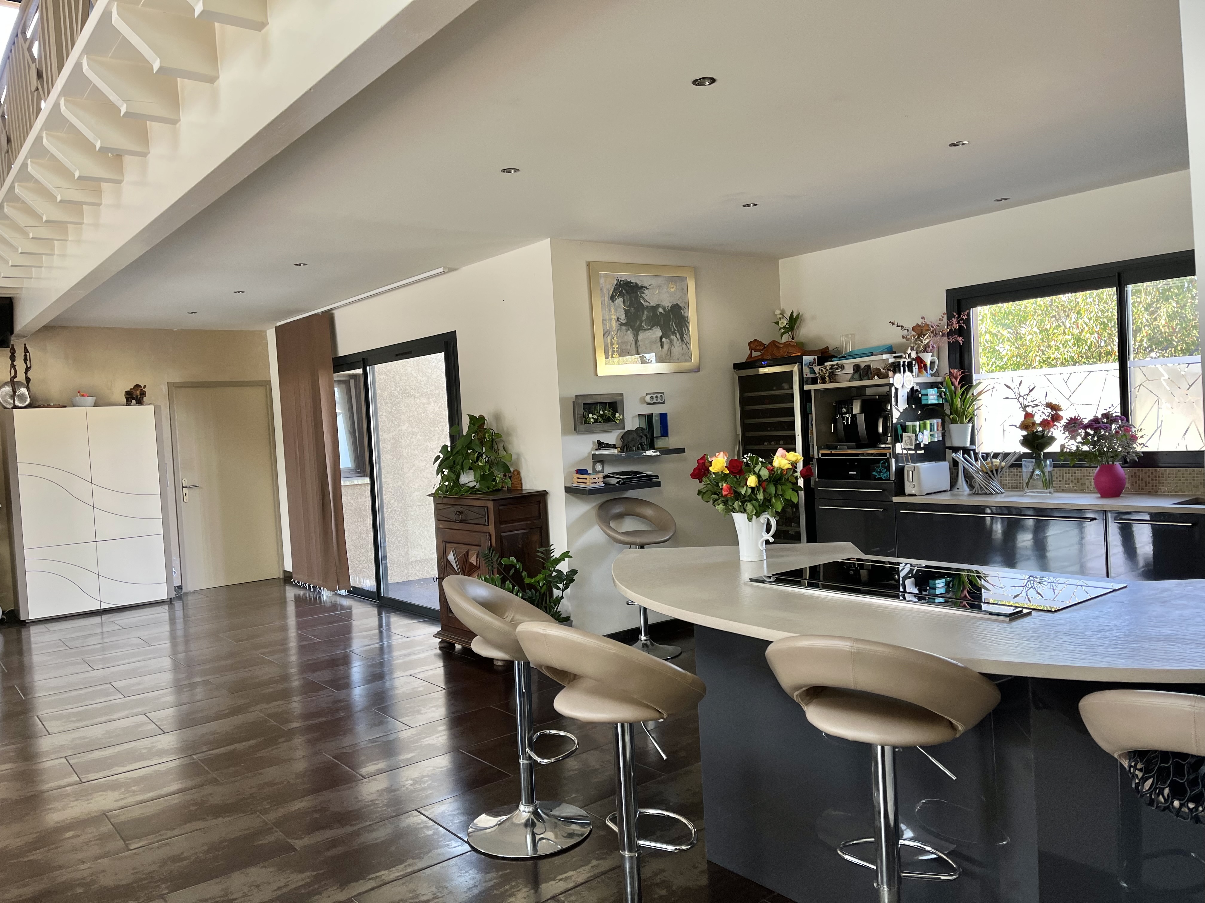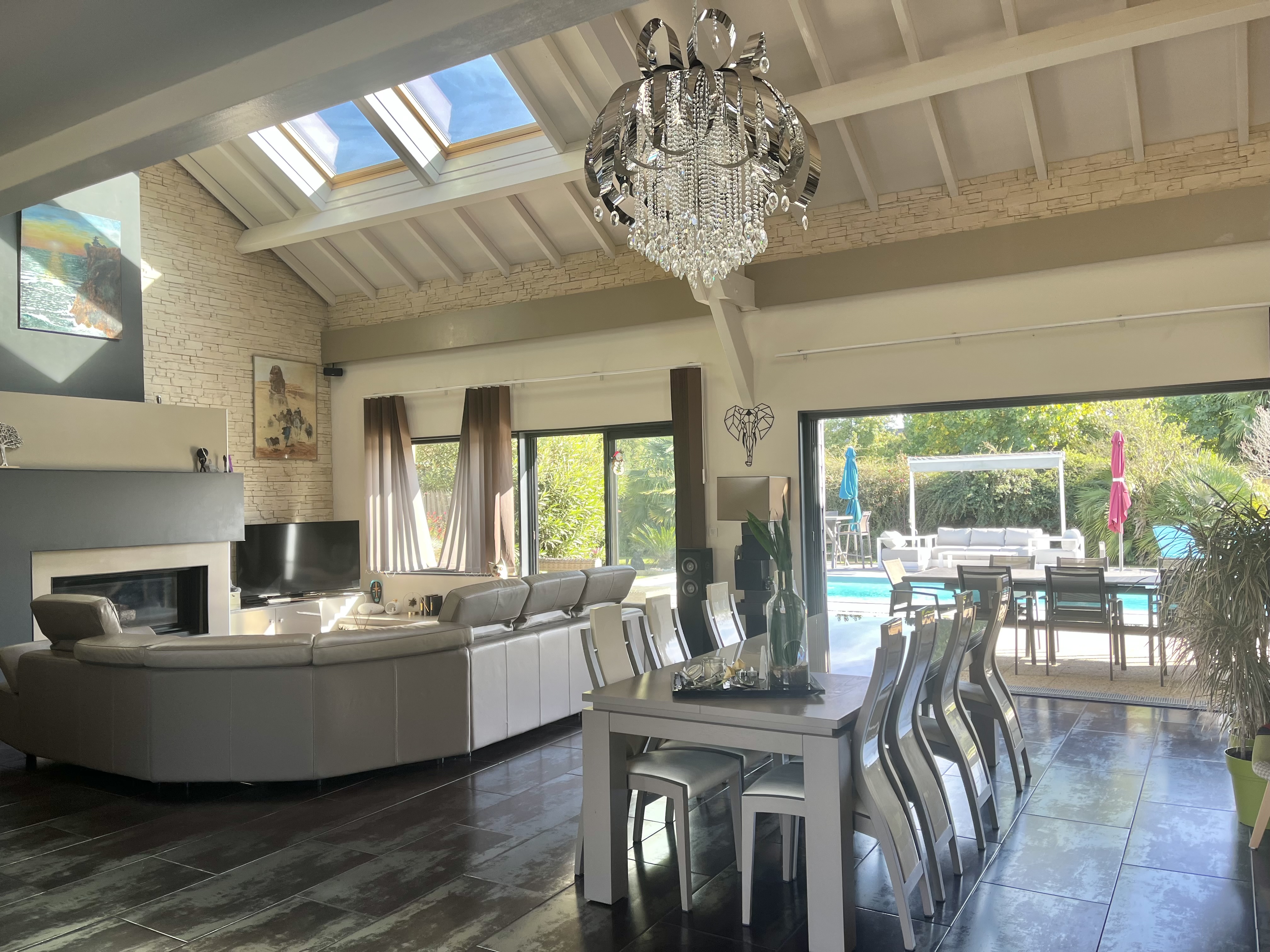 -une entrée avec placards, une cuisine moderne contemporaine ouverte sur un magnifique et grand salon-salle à manger avec sa cheminée donnant sur une terrasse, piscine et jardin verdoyant au Sud, une cuisine d’été équipée abritée avec son barbecue, une buanderie, 4 chambres baignées de soleil dont une chambre parentale ouverte sur l’extérieur avec son dressing et sa salle de bains privative et WC, deux autres chambres pourvues d’une salle de douche , 2 WC.